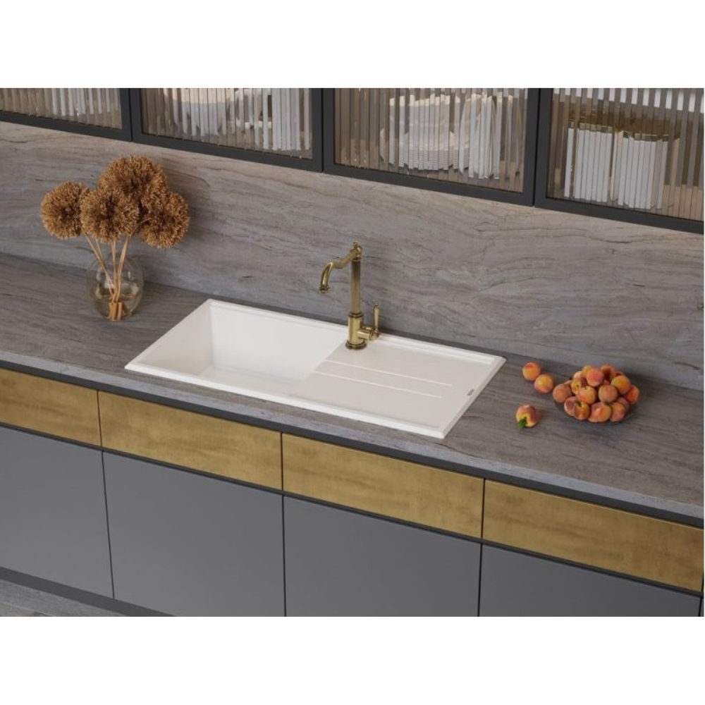 Мойка кухонная Omoikiri из коллекции Tedori 100-SA имеет размеры 1000х510 мм., изготовлена из искусственного гранита. Форма — прямоугольная, одна чаша без отверстия для смесителя. Сифон в комплекте. Ширина чаши 47,8. Врезной монтаж. Имеется крыло.