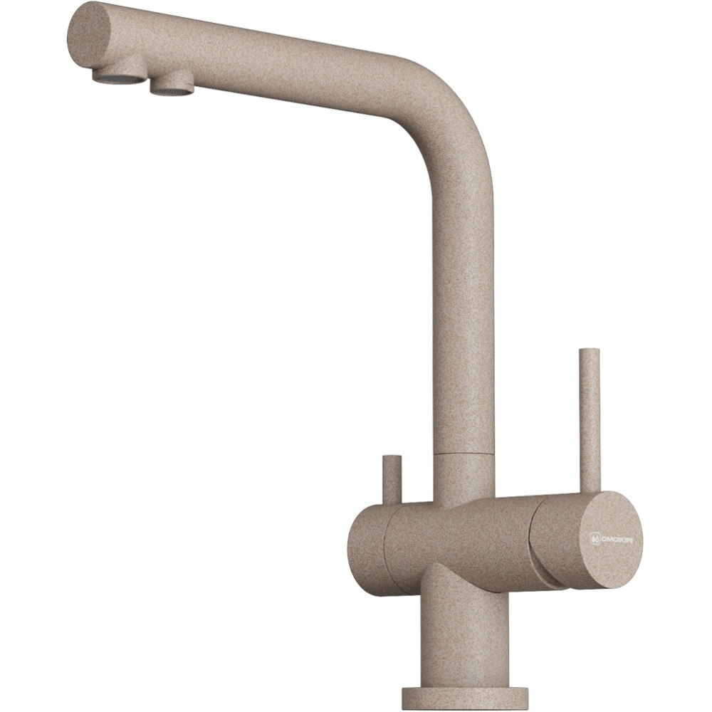 Смеситель для кухни Omoikiri Nagano с подключением фильтра оснащен рычажным управлением для регулировки температуры и напора воды. Горизонтальный монтаж на 1 отверстие. Поворотный излив 176 мм.