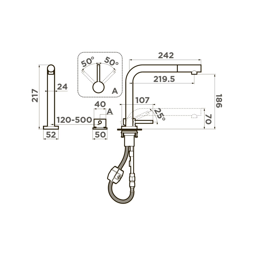 Смеситель для кухни Omoikiri Nara-S оснащен рычажным управлением для регулировки температуры и напора воды. Горизонтальный монтаж на 2 отверстия. Вытяжной излив 220 мм.