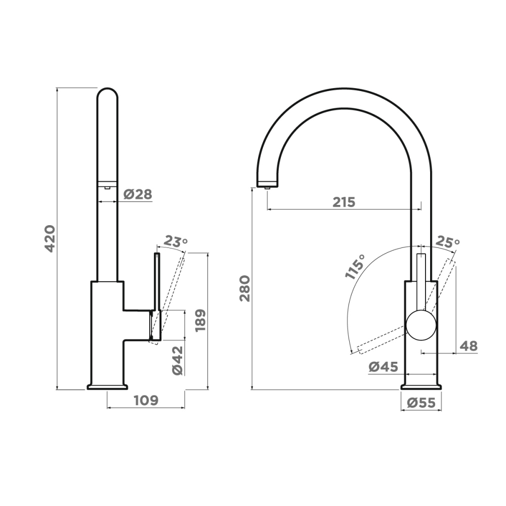 Смеситель для кухни Omoikiri Okawa 2 Plus с подключением фильтра оснащен рычажным управлением для регулировки температуры и напора воды. Горизонтальный монтаж на 1 отверстие. Поворотный излив 215 мм.